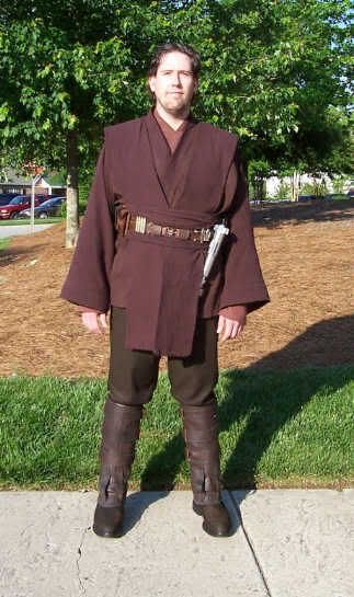 monkey: No, the covertec works just fine with the Graflex clip. Actually, the pommel is what I was worried about, with the spokes coming off it, but it isn't a problem either. JediBaja: I'll take some boot pics and post them when I get a chance. Ky: I did lengthen the skirt about two inches. That was as much as I could lengthen it by putting in an extra strip of fabric under the obi without the seam showing. I would like to just make a new, longer skirt, but I don't have enough fabric left and I haven't been able to match the color yet. I've found that brown crinkle cotton comes in bunches of shades and it's often hard to find the exact same shade again. Since this was $1.00/yd fabric from the Wal-Mart bargain bin, I can't just go get more of it, I have to keep looking til I find the same shade again. If I do, I will put a whole new longer skirt on. I'd rather have a longer skirt, but I think it's at least as long as Bultar Swan's (proportionally), so at least there's a precedent (I think):