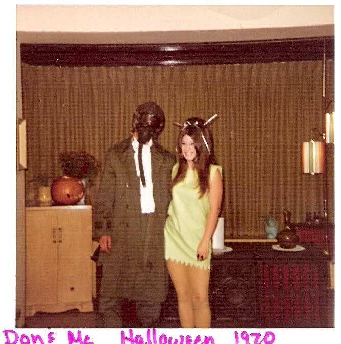I gotta get into these threads more often.... I remember we NEVER had soda except once in a while on a Sunday afternoon....mom would make popcorn on the stove and us 5 kids would split a quart of generic soda (that came in glass-of course). I also remember some of my Aunt's and Uncle's homes that did not have indoor plumbing....we used the outhouse....always fun in the middle of the night....on the farm...with no lights... and... we were talking about old costumes past at the MWB of the RL and I dug this one up.... My Martian costume... I just turned 19... My boyfriend Don in the photo left for boot camp shortly afterward....this was the Vietnam era...  Great costume eh......lol....  Nice legs !!! You were one sexy girl ;D