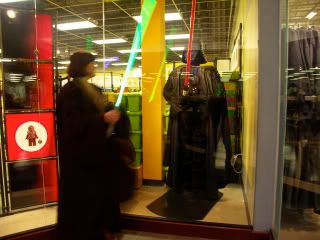 cobalt60: very nice costumes and cute photos of the little ones! Grannywan: good idea about the cards. Never thought of that! Thanthos: I've seen that one before. It's a classic. JediMom: can't see the photos as it wants a log-on I was too tired last night to post or upload the photos. I had about 100 kids come to the door. It was disappointing how bad the costumes were. There were just a couple clever home made ones, a lot of boring commercial ones and an irritating number of kids who wore no costume at all and just came with a pillow case to beg candy. The theme for the porch decor was Star Wars, of course. I had more SW costumes than usual but all were commercial ones: Vader, Clone Trooper, Jango, Anakin and one kid in a sweatshirt carrying a toy lightsaber. They all got SW stickers in addition to candy. I was dressed as Jedi (of course) with my new EL Parks QV lightsaber. The robotic R2D2 was stationed on the sidewalk in "room guard" mode to sound off l when anyone walked up. I hid behind the alcove (and the Qui-Gon standee) to jump out and scare them. I startled a number of adults, too. Hee hee. My neighbor and the friend with him both wanted the info on Parks as they thought they'd want to order a lightsaber. They had 2 of the kids in SW costumes. public.fotki.com/Kait/star_wars/halloween/